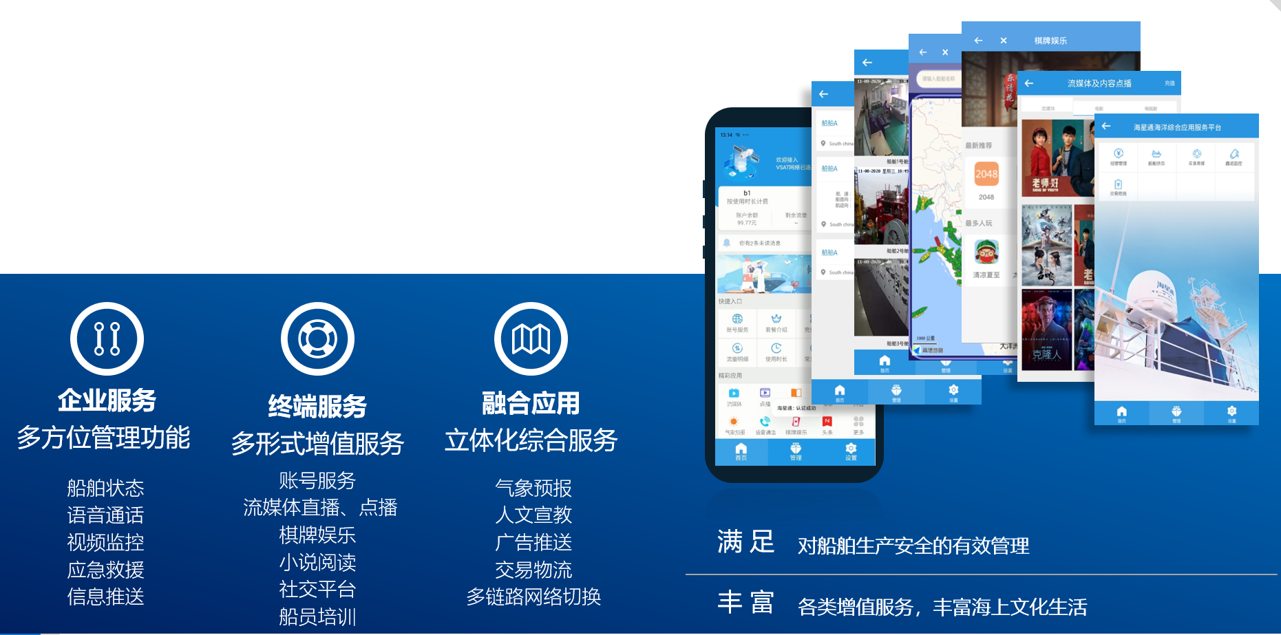 船員可以通過“海星通”APP,隨時享用高速網(wǎng)絡(luò)、流量充值、與家人聯(lián)系,在海上享受流媒體服務(wù)、海上直播、培訓(xùn)等。企業(yè)可以通過“海星通”平臺實現(xiàn)海陸協(xié)同,數(shù)據(jù)、視頻回傳,實時了解船只動向、船舶位置、船跡展示等,此外還可以提供視頻監(jiān)控、視頻會議、流媒體服務(wù)、語音通話、氣象預(yù)報等服務(wù)。“海星通”更是提供過多次海上救援的通信保障任務(wù),確保海上工作、生活、娛樂全無憂。
